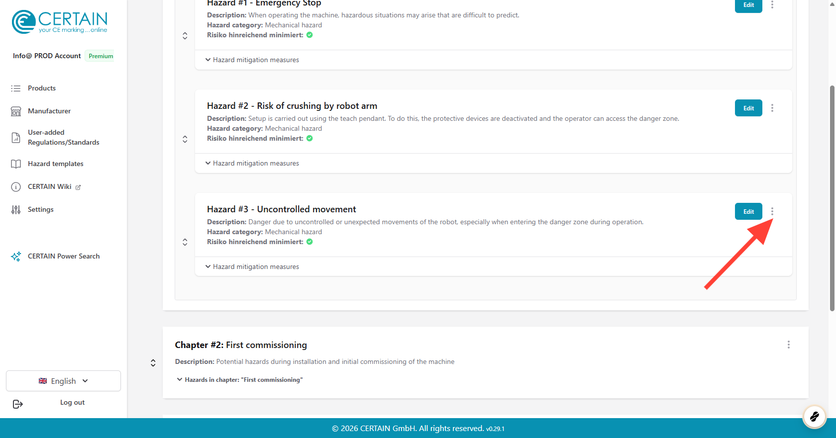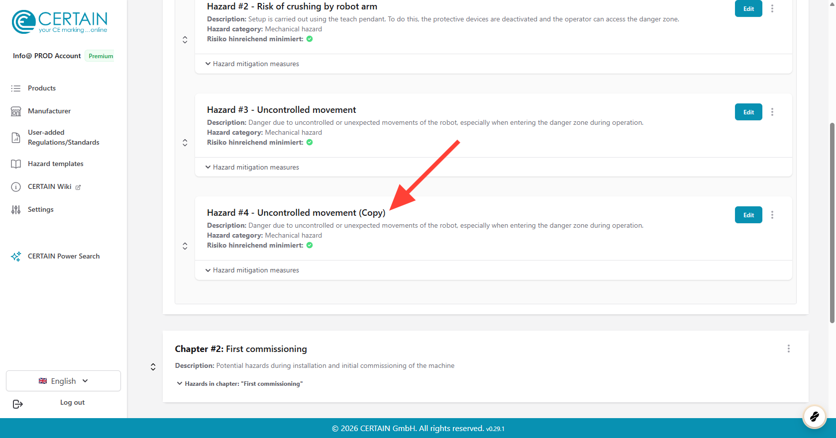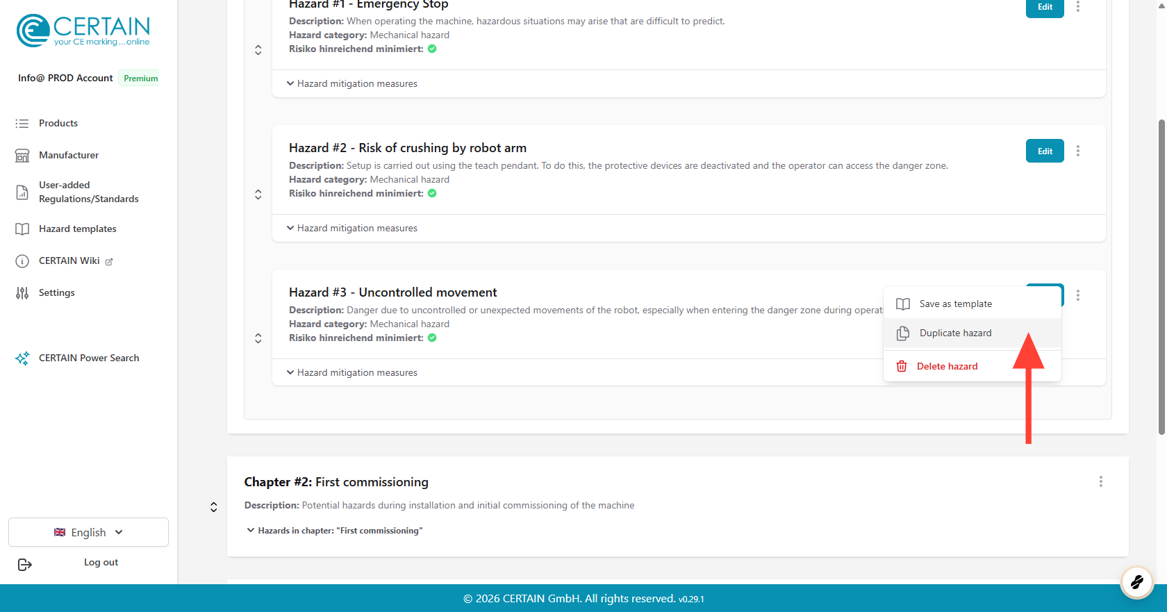 CERTAIN gives you the option to duplicate hazards within a risk assessment. If similar hazards have been identified for a product then you can save significant time and effort by copying an existing hazard and then editing only those parts needing amendment.
